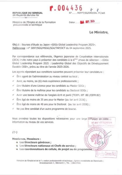 Le Ministère de l’Emploi et de la Formation professionnelle et technique, en collaboration avec l’Agence Japonaise de Coopération Internationale (JICA), annonce l’ouverture des candidatures pour les bourses d’étude au Japon dans le cadre du SDGs Global Leadership Program 2025.