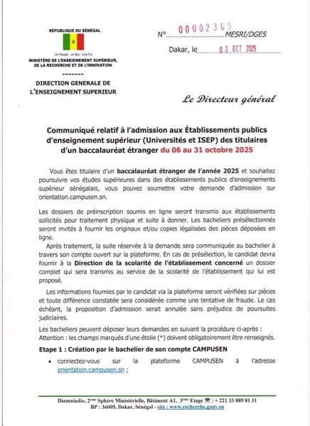 Communiqué : L’admission aux Établissements publics d’enseignement supérieur (Universités et ISEP) des titulaires d’un baccalauréat étranger…