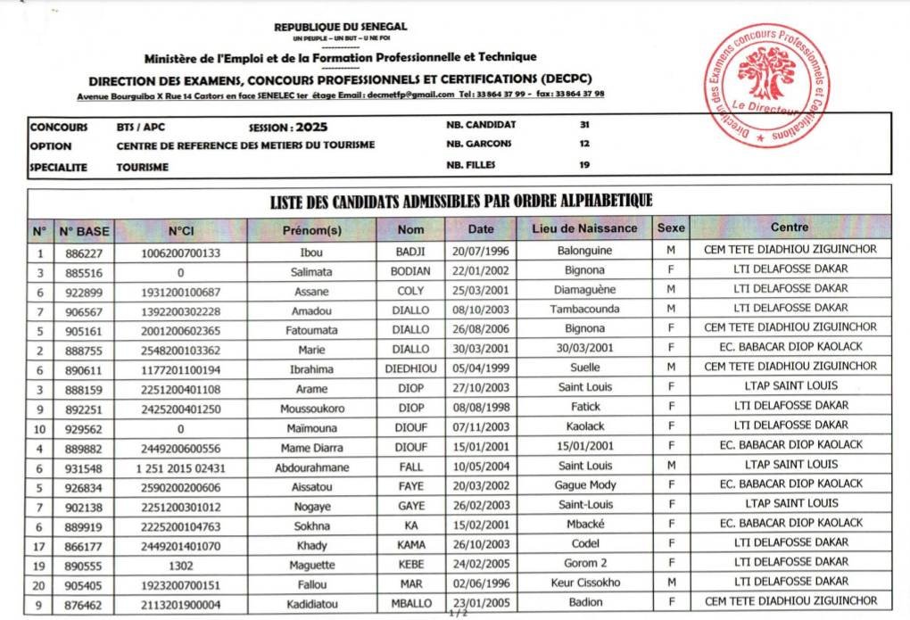 Résultats Admis définitifs concours BTS Tourisme